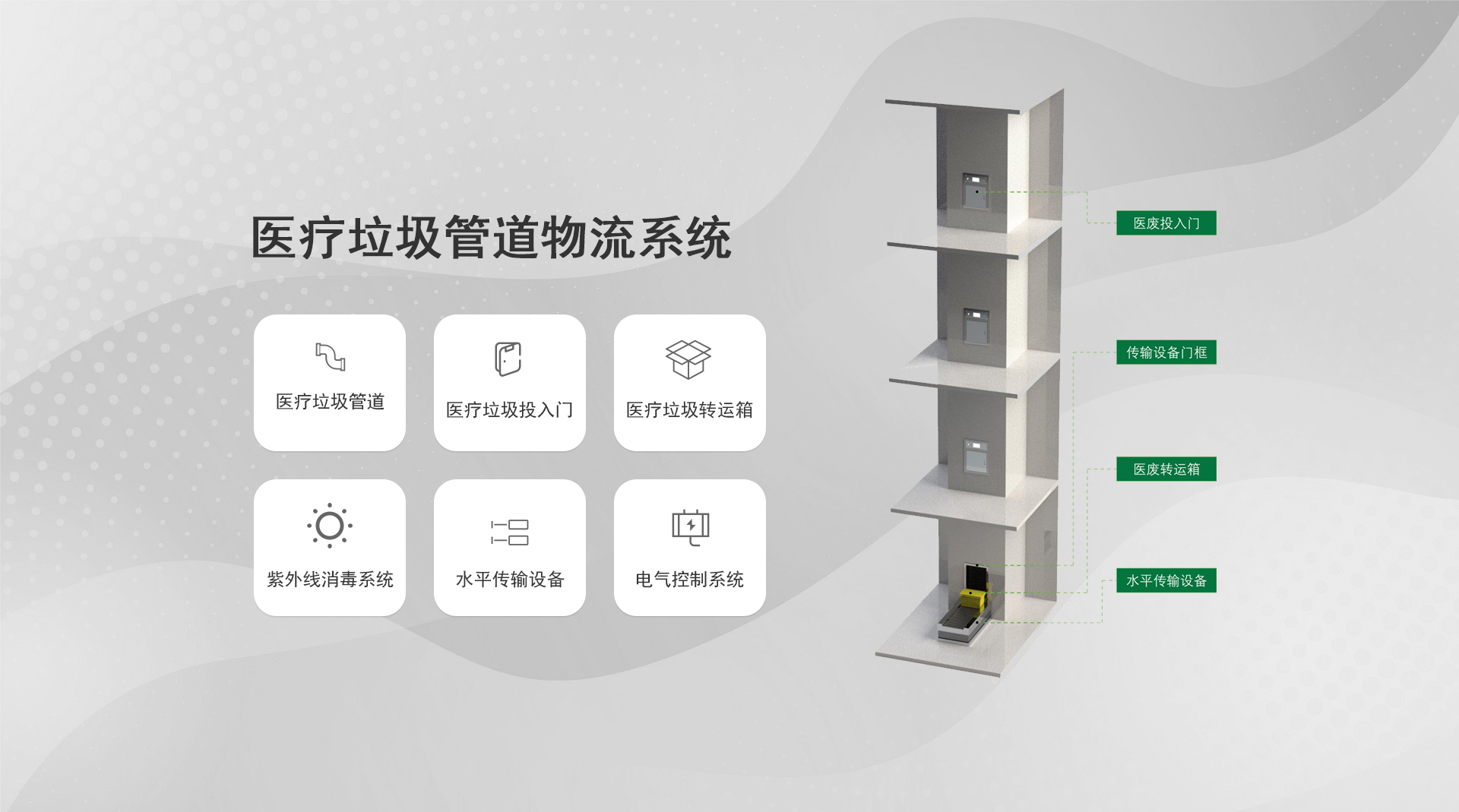 系統(tǒng)簡介:通過氣力式輸送管道對醫(yī)院內(nèi)的垃圾和污衣被服進(jìn)行收集,是一種對垃圾實(shí)行全封閉、壓縮化、集裝化收運(yùn)的現(xiàn)代垃圾運(yùn)輸及匯集方式...